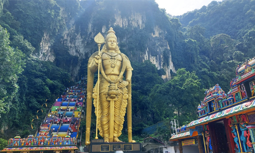 La montagna come sfondo, centinaia (272) di gradini colorati che entrano all’interno di essa e una altissima statua dorata sono il colpo d’occhio di questo luogo. La statua è quella del Signore Muruga, Dio indù della guerra, figlio di Shiva. È stata messa qui solo nel 2006 e con la sua altezza di 42, 7 metri si dice che sia la statua più imponente del mondo.